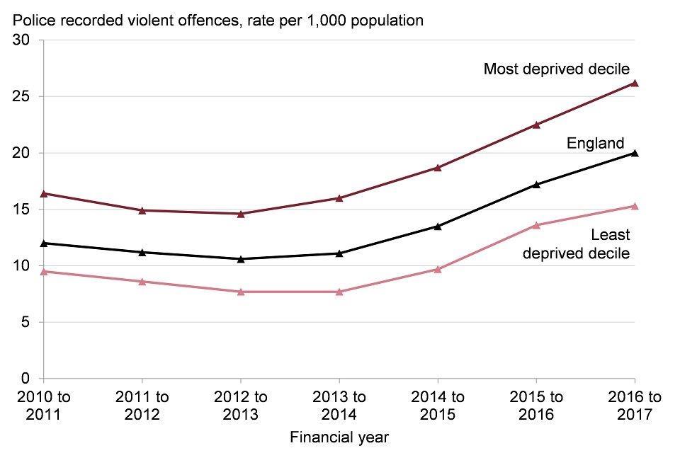 Police recorded offences for violence against the person in England have increased from 10.6 per 1,000 in financial year 2012 to 2013, up to 20.0 per 1,000 in 2016 to 2017 (Figure 10). For people living in the most deprived upper tier local authorities the rate was 26.2 per 1,000, compared with 15.3 per 1,000 in the least deprived areas. The gap between the most and least deprived areas has widened as rates increased. A similar pattern is evident for police recorded violent sexual offences, both in the trend for England and for differences between the most and least deprived areas, though at the much lower rate of 1.9 per 1,000 in England in 2016 to 2017.