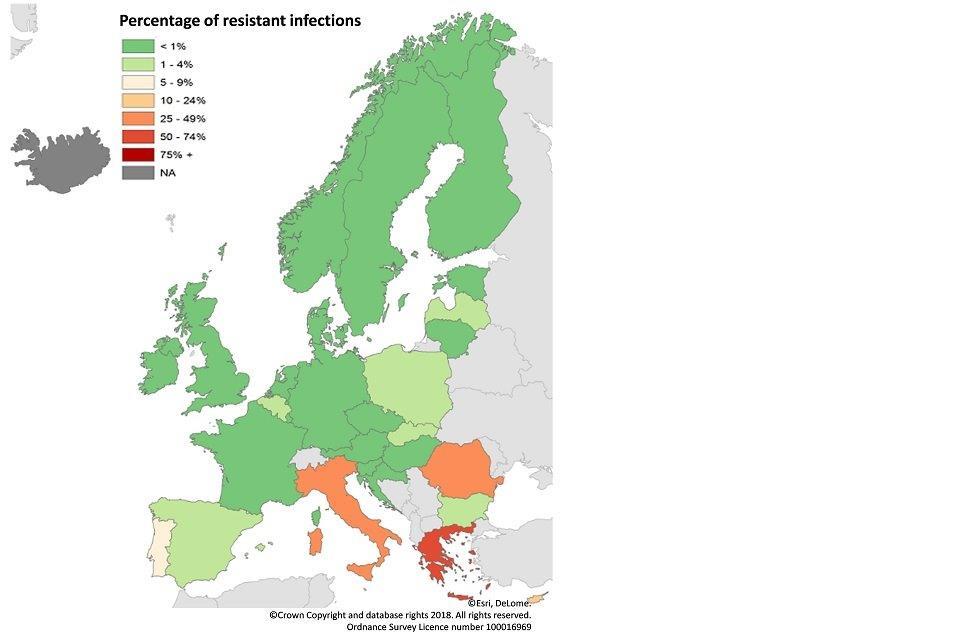 Figure 2: percentage of Klebsiella pneumoniae infections resistant to carbapenem antibiotics, Europe, 2016 [Source: Surveillance atlas of infectious disease. Produced by European Centres for Disease Control, 2016]