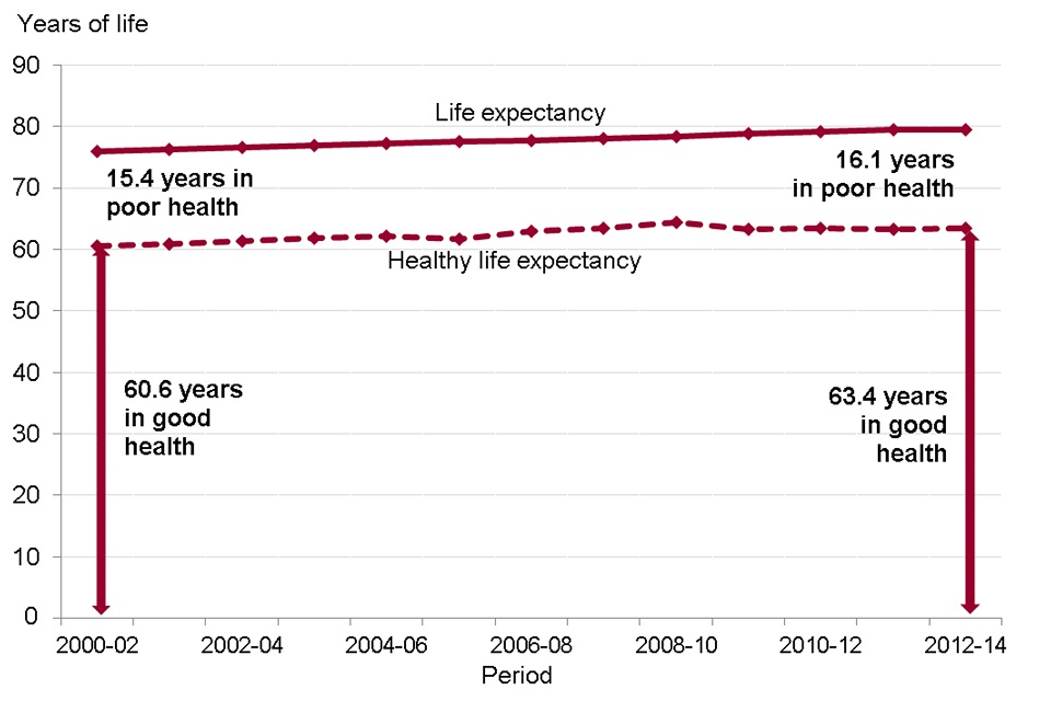 Healthy life expectancy has remained much lower than life expectancy and data for 2013 to 2015 from ONS indicate that it is now 63.4 years for males and 64.1 for females.