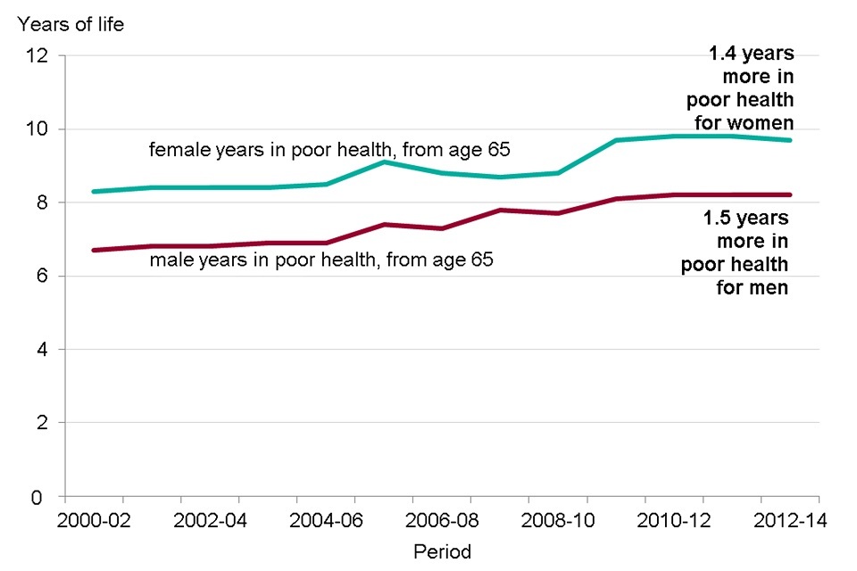 The proportion of life from age 65 spent in poor health has also increased slightly for both sexes. For males, it has increased from 41.6% in 2000 to 2002 to 43.6% in 2012 to 2014, and for females, it increased from 43.2% in 2000 to 2002 to 45.8% in 2012 to 2014.