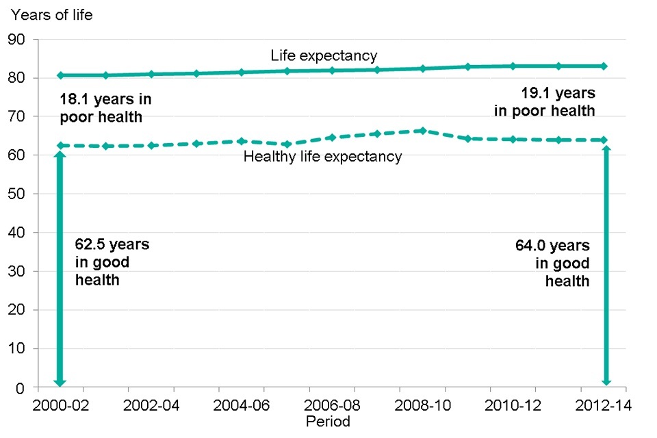 Since 2000 to 2002, life expectancy has increased by more years than healthy life expectancy and therefore the number of years lived in poor health has also increased slightly; in 2013 to 2015 it was 16.1 years for males and 19.0 years for females. However, the proportion of life spent in poor health has remained stable and these data do not take into account trends in the types and severity of diseases over time.