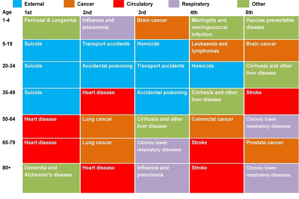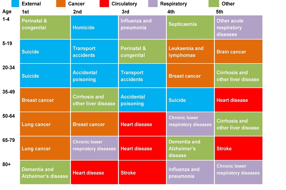 ONS (2016) Registered deaths by age, sex, selected underlying causes of death and the leading causes of death for both males and females. Office for National Statistics Accessed 20 December 2016. ↩