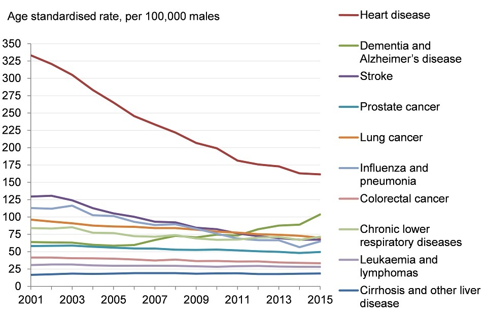 For males, death rates from heart disease and stroke have halved since 2001, whereas the death rate from dementia and Alzheimer’s has increased