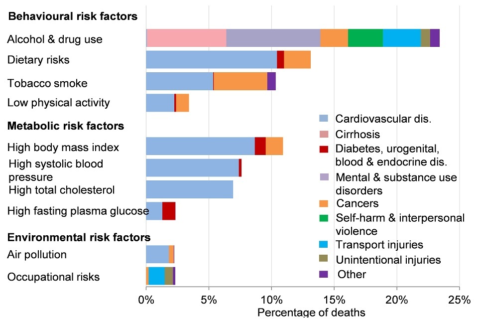 The trends and causes of death in the population are influenced by a broad range of factors. Using the Global Burden of Disease (GBD) model it is possible to identify the behavioural, metabolic and environmental risk factors contributing to deaths in each age group and also by each cause. The behavioural risk factors contributing to the highest proportion of deaths in 2013 were poor diet and tobacco smoking.