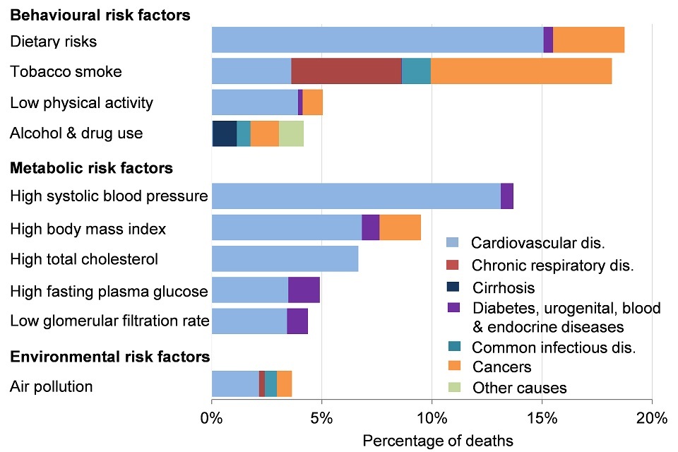 Using the Global Burden of Disease (GBD) model, certain risk factors for disease can be ranked based on the proportion of deaths they are associated with (figure 3 and 4). The GBD divides risk factors into three main groups: behavioural, metabolic and environmental. Metabolic risk factors include a high body mass index (BMI) and high cholesterol.