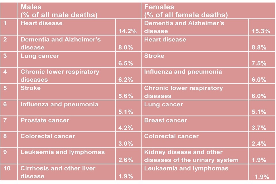- for females, dementia and Alzheimer’s disease was the most common cause of death, followed by heart disease