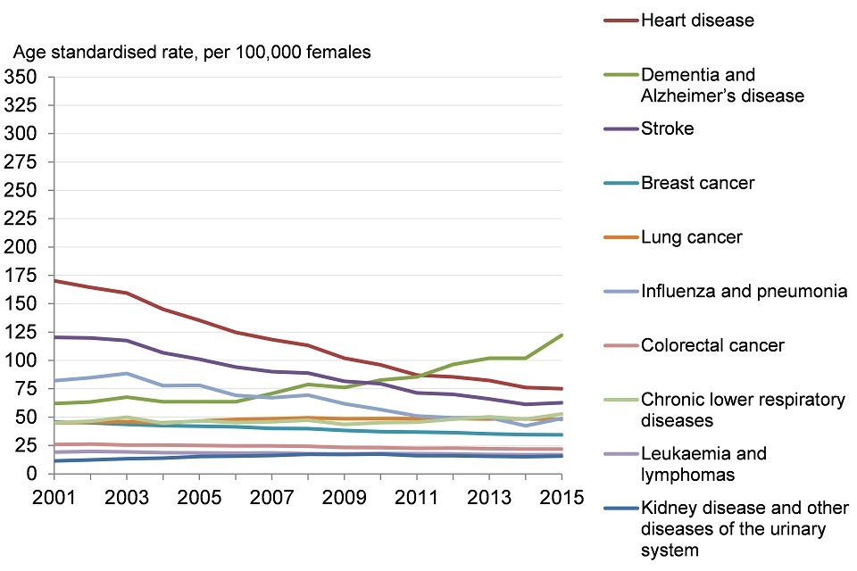For females, the death rates from heart disease and stroke have halved since 2001, whereas the death rate from dementia and Alzheimer’s disease has doubled