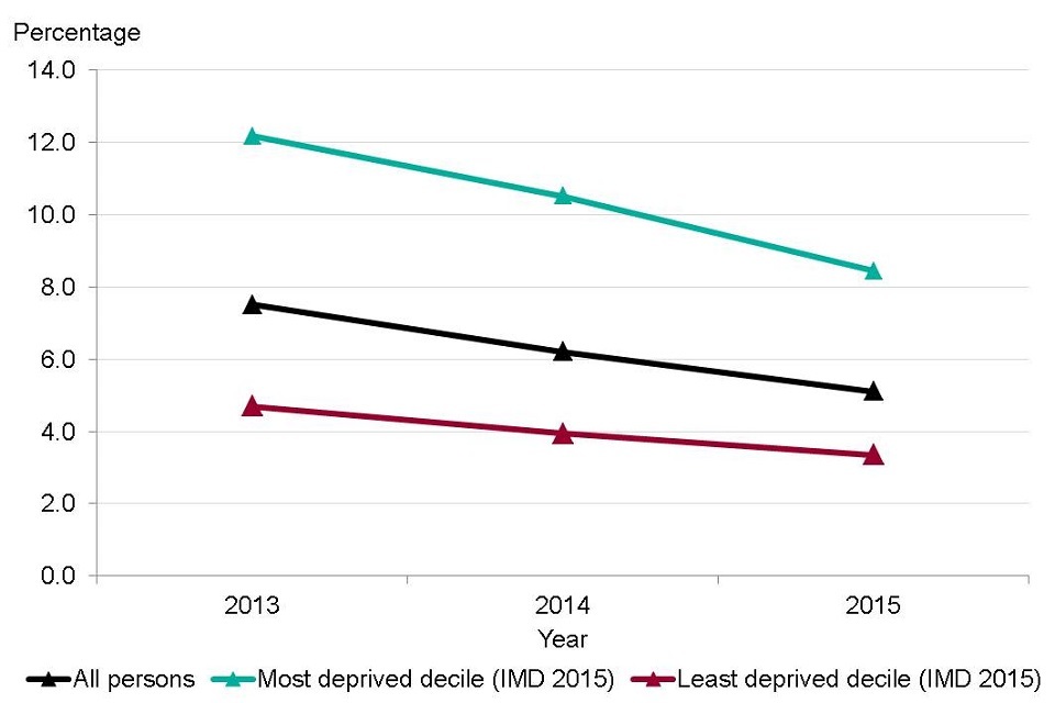 - the gap between unemployment in the most and least deprived decile has decreased from 7.5 percentage points in 2013 to 5.1 percentage points in 2015