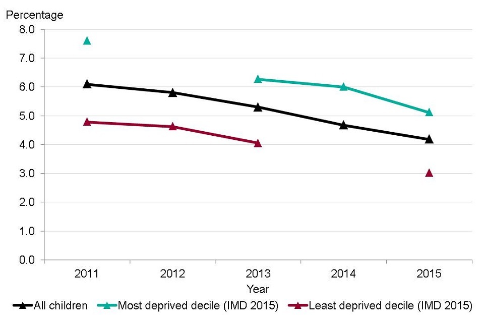 Figure 4. Percentage of 16-18 year olds not in education, employment or training (NEET) by Index of Multiple Deprivation (IMD) 2015 decile based on upper tier local authorities in England, 2011 to 2015 [Source: Public Health Outcomes Framework]