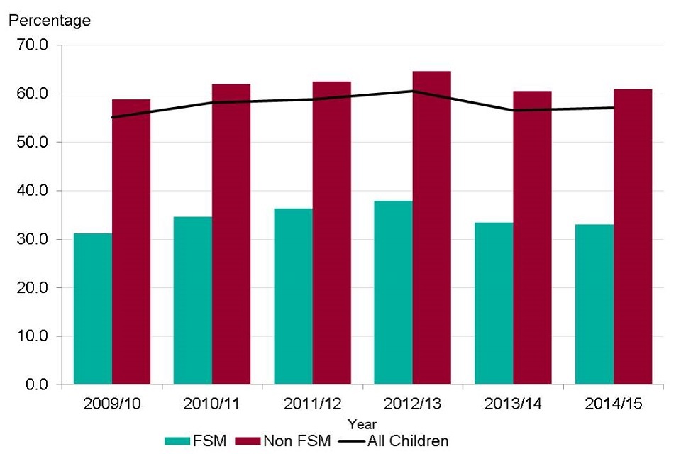 A total of 14% of children were eligible for free school meals in the academic year 2014 to 2015. Only a third (33.1%) achieved 5 good GCSEs (including maths and English), while nearly twice as many (60.9%) pupils not eligible for free school meals attained this level (figure 3). There has been little change in the size of the attainment gap between these 2 groups of children in recent years.
