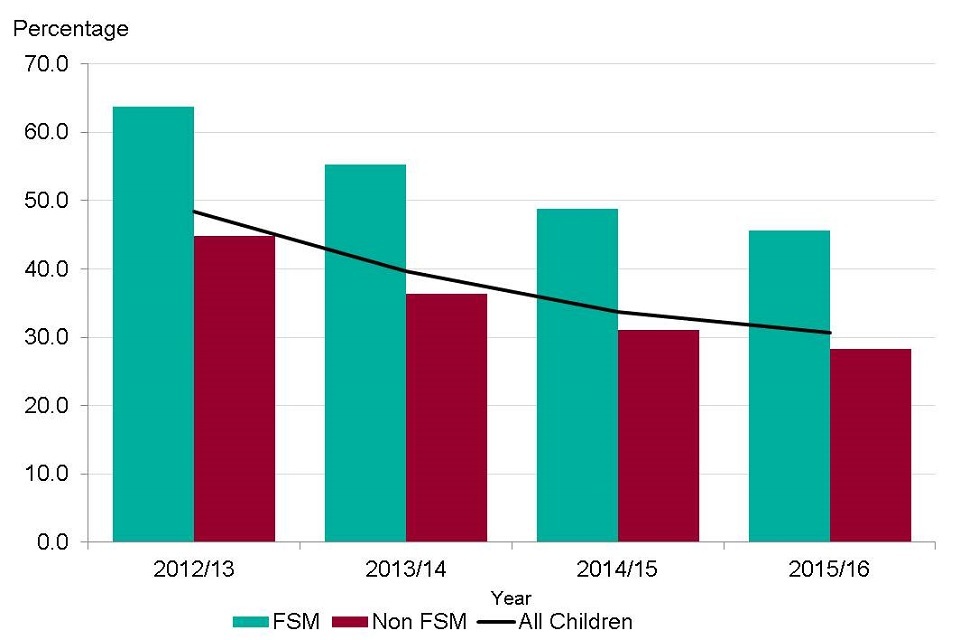 3.1 Figure 2: percentage of children who are not achieving a good level of development at the end of Reception Year (age 5) by free school meal status, England, 2012 to 2013 up to 2015 to 2016