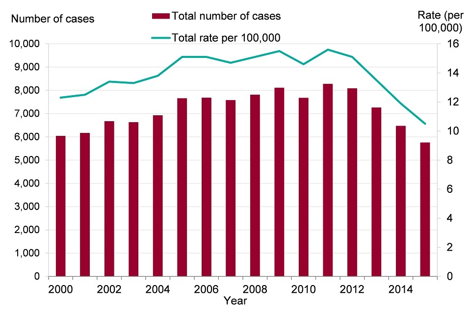 Figure 7. Tuberculosis case notifications and rates, England 2000 to 2015 [Source: Tuberculosis in England 2016]