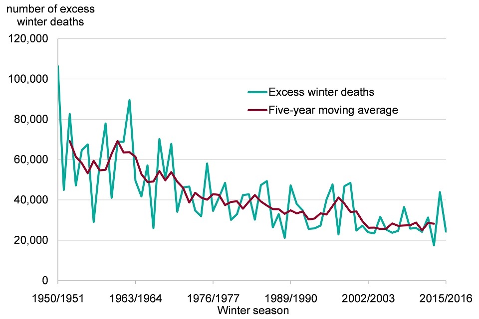 Figure 2. Excess winter deaths, single years and five-year central moving average , England and Wales, 1950 to 1951 to 2015 to 2016 [Source: ONS Excess winter mortality in England and Wales]