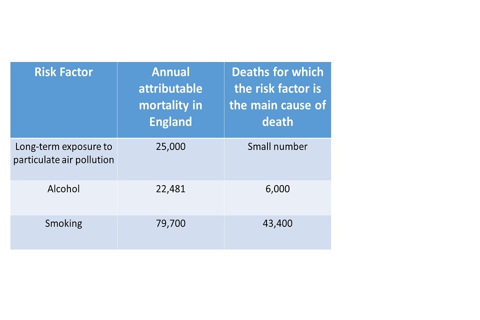 In England, particulate pollution from human activities is estimated to have an effect on mortality equivalent to approximately 25,000 deaths annually [footnote 23]. Air pollution is unlikely to be the sole or primary cause of deaths, but is thought likely to be a contributory factor to a much larger number of deaths than this. This estimated figure of attributable deaths is similar in size to that for alcohol, and about one-third of that for smoking (figure 5).