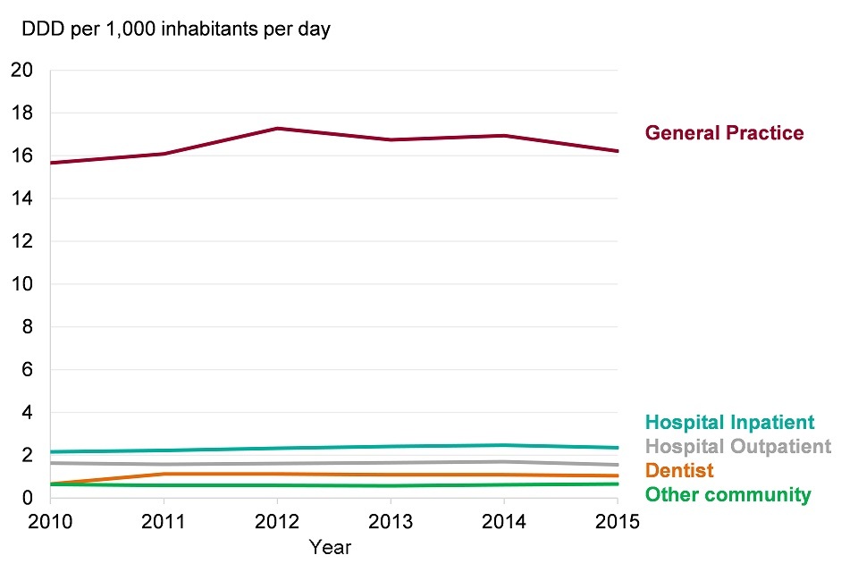 - general practice (GP) was the largest prescribing setting and consumption decreased from 17.3 to 16.2 DDD per 1,000 inhabitants per day (- 6.1%) between 2012 and 2015