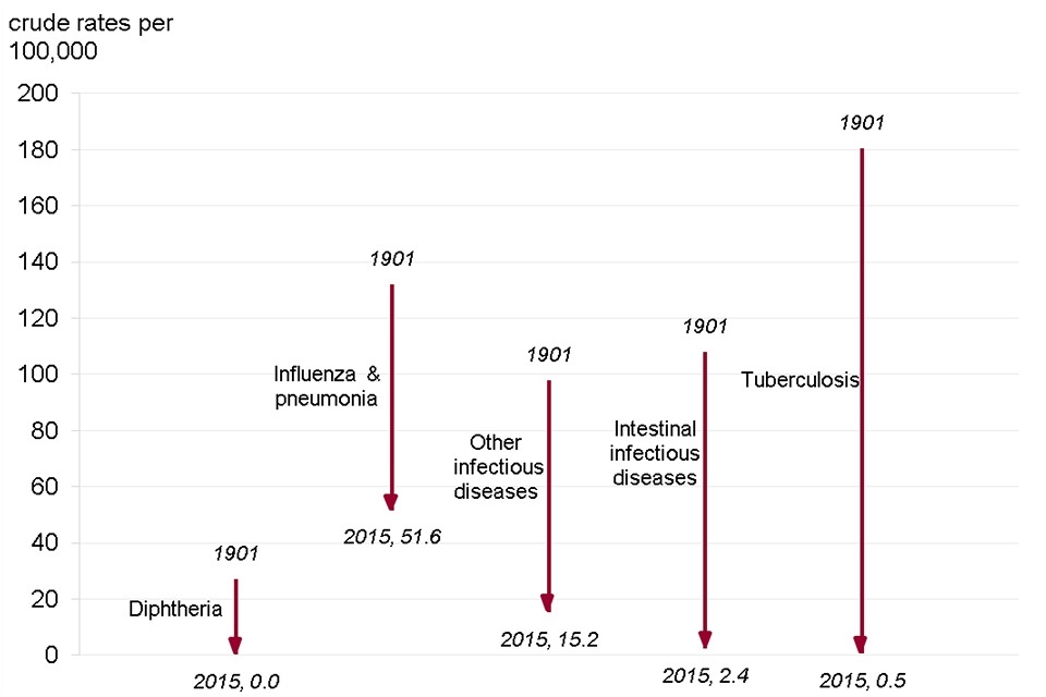 In 1901, 32% of deaths were due to infectious diseases compared to 8% in 2015