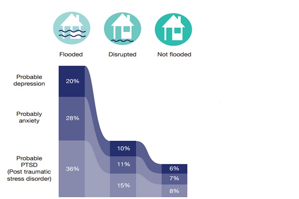 The risk of mental health issues in people whose homes have been flooded is 6 times higher than in those who are unaffected by flooding