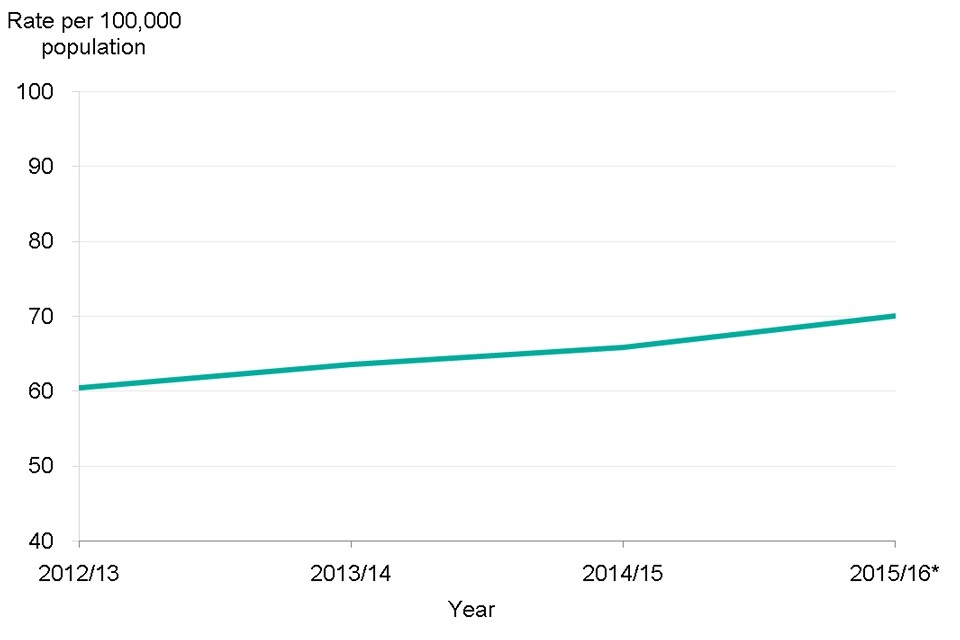 - rates of E. coli bacteraemia increased from 60.4 per 100,000 in 2012 to 2013 to 70.0 per 100,000 in 2015 to 2016