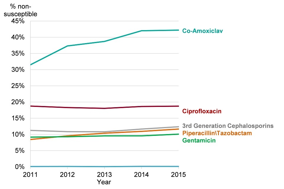 - however, resistance to the antibiotics piperacillin/tazobactam and co-amoxiclav increased from 8.5% to 11.7% and 31.5% to 42.2% respectively between 2011 and 2015