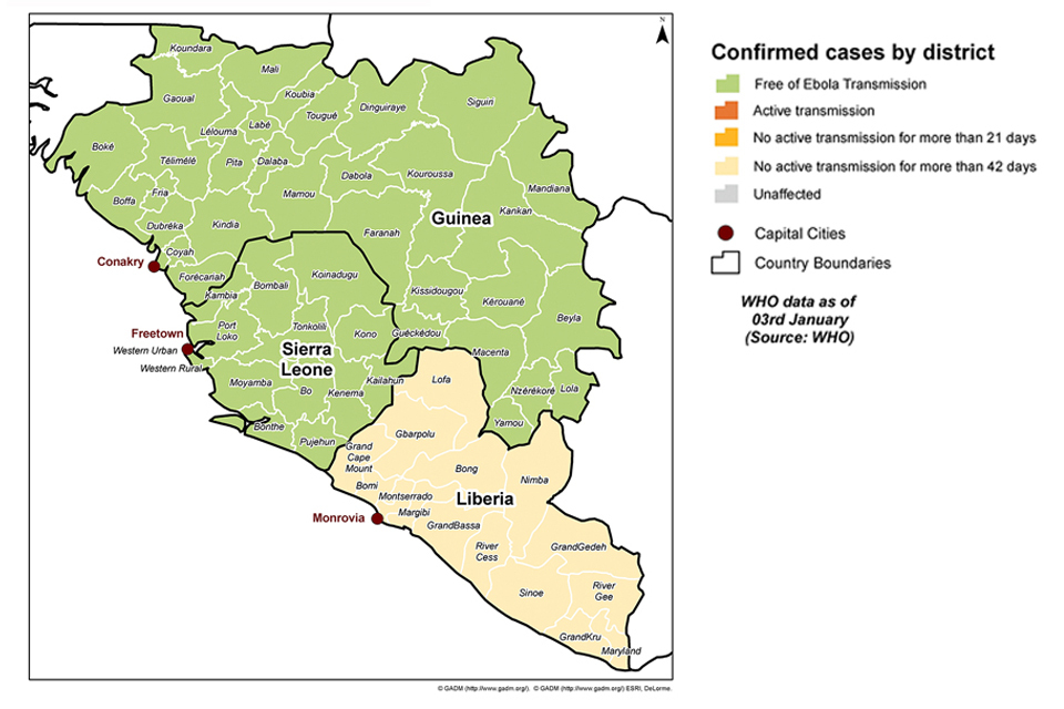 Ebola virus disease distribution map (WHO data as at 3 January 2016)