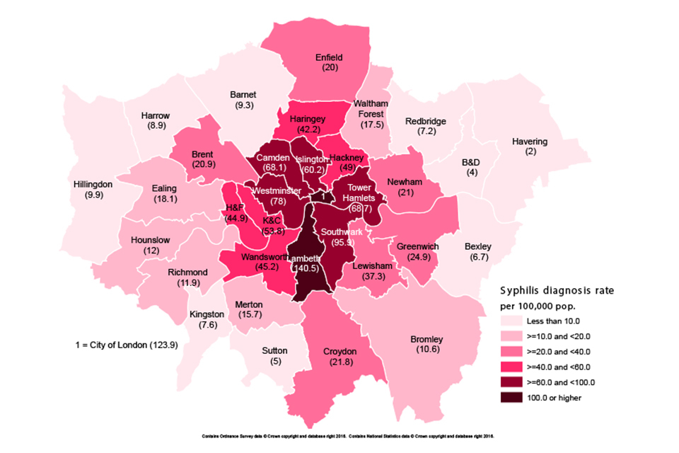 - the rate of diagnosis of new syphilis cases in London in 2015 was 32.9 cases per 100,000 population, compared with 9.3 cases for the country as a whole (see map below)