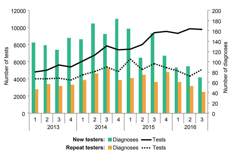 Since 2012, national guidelines have recommended up to three-monthly HIV testing for MSM at high risk of acquiring HIV [4]. Among the five clinics that observed a large-fall in HIV diagnoses, the number of HIV tests rose by 50% from 8,820 in January–March 2013 to 14,820 in July–September 2016. While the number of new testers (ie those not tested in the previous two years) was stable at around 5,000 per quarter, the number of repeat testers (ie those who had an HIV test within the previous two years) increased by 60%, from 4,800 to 9,760 (see figure). The three year rise in testing in the large-fall clinics coincided with an initial increase in HIV diagnoses during 2014, but in early 2015 the decline occurred predominantly in new testers. The median CD4 count at HIV diagnosis of men diagnosed at large-fall clinics increased substantially (from 469 in 2013 to 548 in 2015), indicating men were being diagnosed soon after infection. (In other London clinics, the number of new and repeat testers remained stable, and outside London, new and repeat testers increased equally, although there was no discernible effect on HIV diagnoses in either setting.)