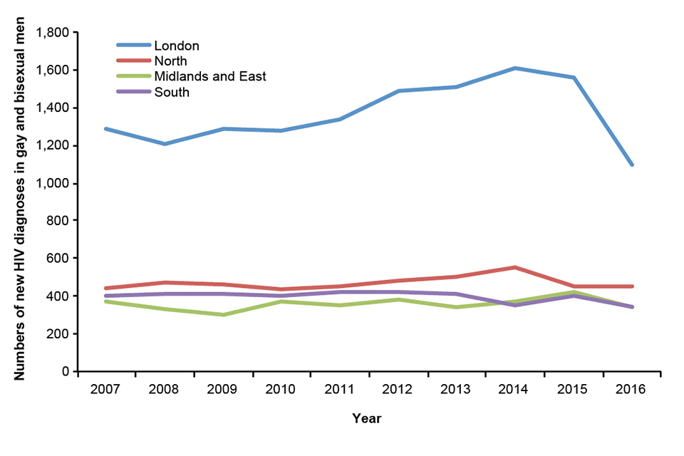 New HIV diagnoses in gay and bisexual men, by region of residence, 2007-2016, England