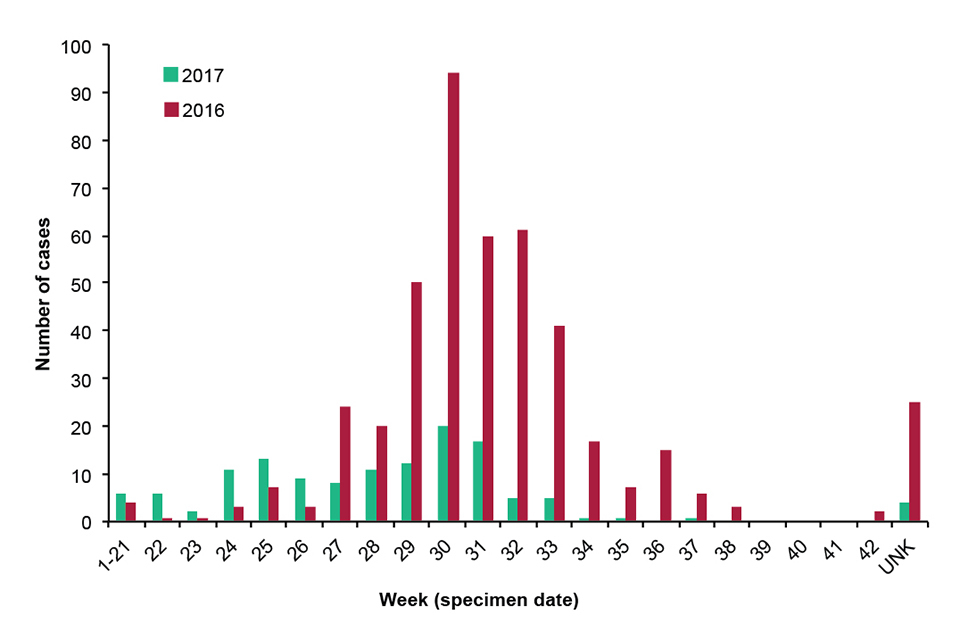 Although six cases were reported earlier in 2017 (two in January, one in March, three in May) cases began to increase from the beginning of June (week 22), with the majority of cases reported in June and July – a total of 92 – between weeks 22 and 30 (see figure), compared to 203 cases reported in the same period in 2016 (55% decrease).