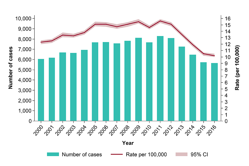 In 2016, there were 5,664 TB cases notified, down from 5,727 in 2015. Following annual declines of at least 10% in the number of cases between 2012 and 2015, the decline in 2016 has slowed to 1%. The incidence rate in 2016 was 10.2 per 100,000 (CI 10.0-10.5), compared with 10.5 per 100,000 (CI 10.2-10.7) in 2015, and is the lowest incidence in England since the start of enhanced TB surveillance in 2000 (see figure).