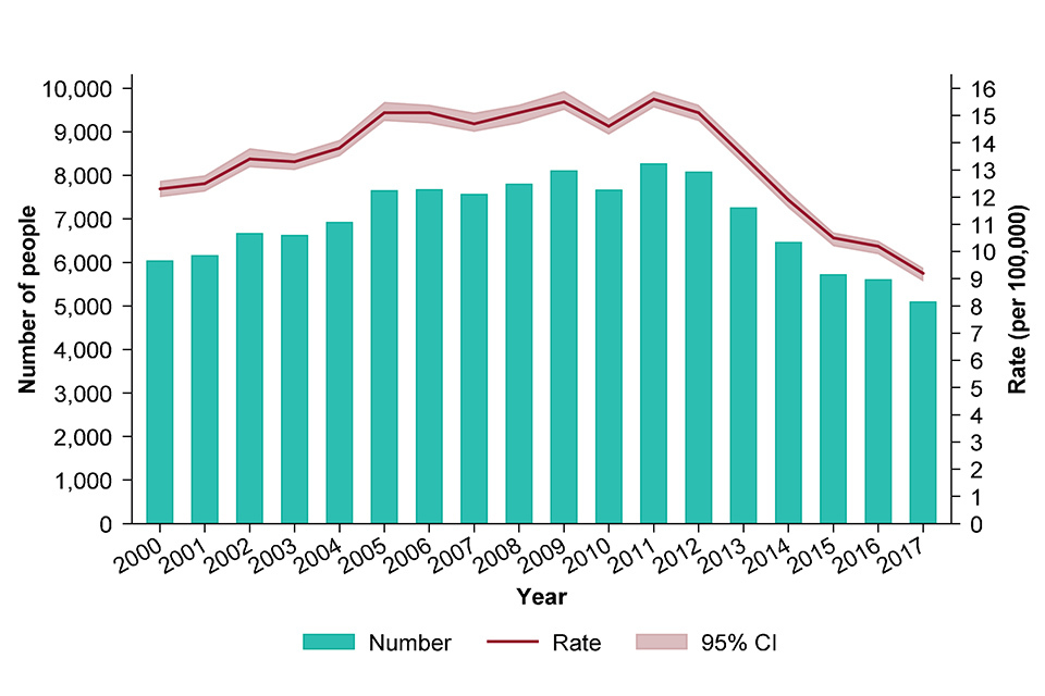 In 2017, there were 5,102 people notified with TB, down from 5,616 in 2016. This decline marks a return to the annual declines of 10% achieved between 2012 and 2015. 2017 saw the lowest number of notifications since 1990, and a 38% decline since the peak in 2011. The incidence rate in 2017 was 9.2 per 100,000 (CI 8.9-9.4), compared with 10.2 per 100,000 (CI 9.9-10.4) in 2016, and is the lowest rate of TB in England since the start of enhanced TB surveillance in 2000 (see figure).