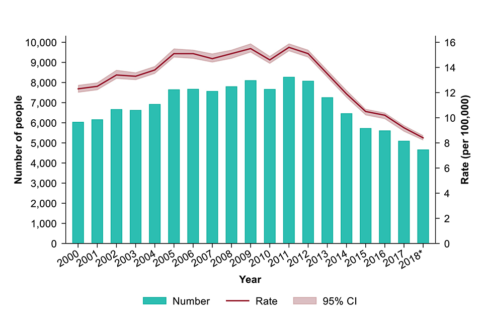 Number of TB case notifications and rates, England, 2000 to 2018 (provisional data).