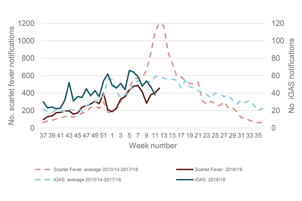 Weekly scarlet fever and iGAS notifications in England, 2010/11 onwards