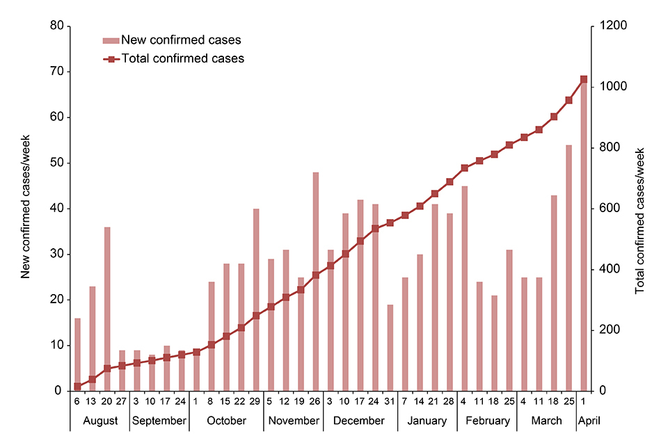As of 3 April 2019, 1,034 confirmed and 66 probable cases have been reported in North Kivu and Ituri provinces [1]. Of these, 210 were newly confirmed cases reported between 1 March and 3 April, twice the number in the last monthly update. Substantial week-on-week increases in cases have been seen in each of the last three weeks (see figure) with the week to 1 April recording the highest number to date during this outbreak. There have been 690 deaths, 137 since the last update.