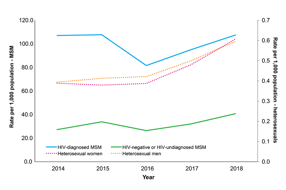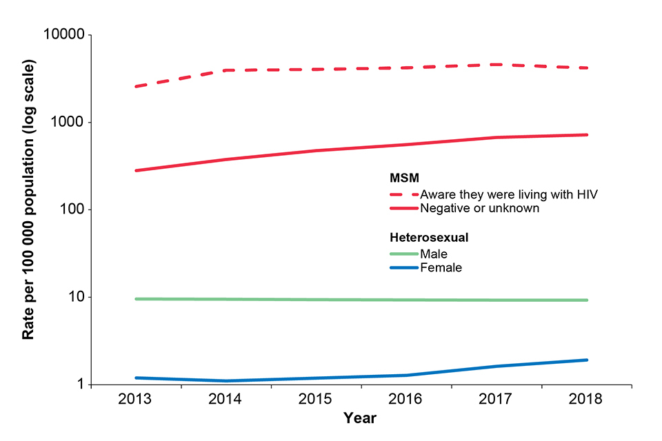 The number of diagnoses of infectious syphilis seen in England has increased substantially in recent years. Following a gradual increase in diagnoses between 2000 and 2012, an increase of 126% was seen between 2013 (3,344) and 2018 (7,541), including a 5.5% increase between 2017 and 2018. In 2018, most diagnoses (75%) were made in gay, bisexual and other men who have sex with men (MSM) and the diagnosis rate was highest in MSM who were aware that they were living with HIV at the time of syphilis acquisition (see figure).