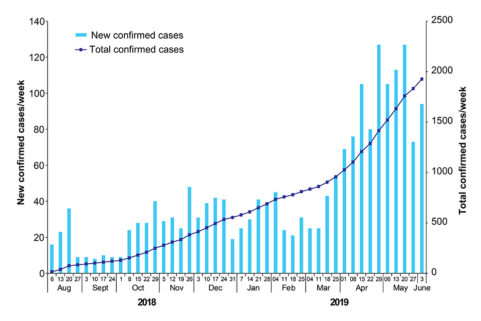 The outbreak of Ebola virus disease in eastern Democratic Republic of the Congo continues. As of 3 June 2019, 1,926 confirmed and 94 probable cases had been reported in North Kivu and Ituri provinces [1]. Of these, 459 were newly confirmed cases reported between 1 and 31 May, the largest monthly total to date in this outbreak. There have been 1,354 deaths, 370 since the last update.
