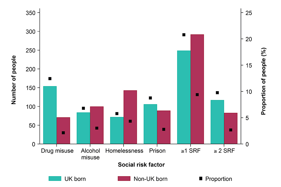 Number and proportion of people with TB (aged 15 years and above) who had social risk factors, by place of birth 2013 to 2017.