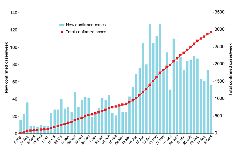 As of 3 September 2019, 2,940 confirmed and 109 probable cases had been reported in North Kivu, Ituri and South Kivu provinces [1]. Of these, 2,050 had died but over 900 patients survived the infection. Between 1 and 31 August, 307 newly confirmed cases were reported, the lowest monthly total since March 2019.