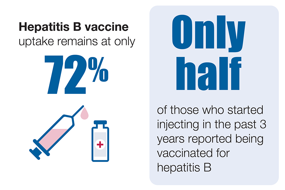 Hepatitis B remains uncommon in PWID but vaccine uptake needs to be sustained, especially in younger age groups and recent initiates to injecting where the uptake of vaccination is particularly low.