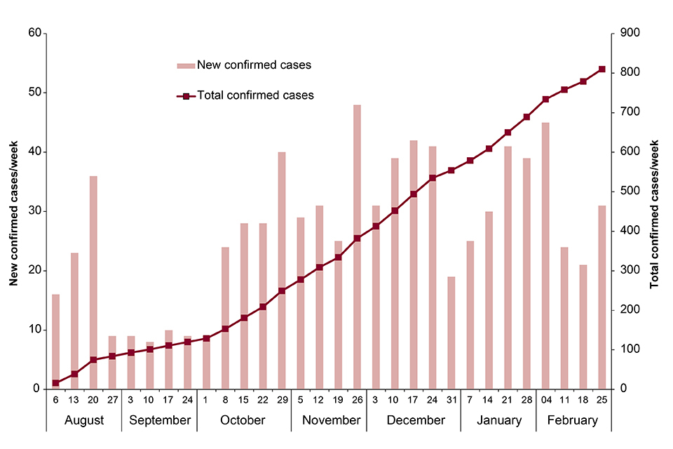 As of 26 February 2019, 814 confirmed and 65 probable cases have been reported in North Kivu and Ituri provinces [1]. Of these, 104 were newly confirmed cases reported between 1 and 26 February. The increase in cases noted during January was not sustained through February. However, recent incidents of unrest have again prevented response activities and case numbers have shown a small increase in the last week (see figure). Since the start of the outbreak, there have been 553 deaths, 88 since the last update.