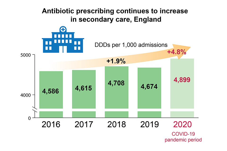 When secondary care consumption rates were assessed as DDDs per 1,000 hospital admissions, a greater increase compared to previous years was seen between 2019 and 2020, driven by an increase in inpatient prescribing (6%). Changes in prescribing during the coronavirus (COVID-19) pandemic had been expected. These increases in hospital inpatient consumption are thought to be largely related to changes in hospital populations (with cancellations of elective procedures) and reductions in hospital admissions during the COVID-19 pandemic. Antimicrobial stewardship (AMS) teams will need to work tirelessly with prescribers in the coming 12 months to reverse this trend.