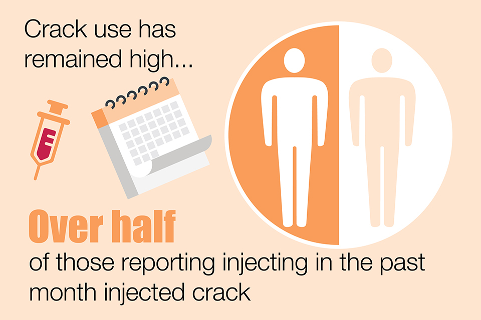 Crack use has remained high. Over half of those reporting injecting in the past month injected crack.