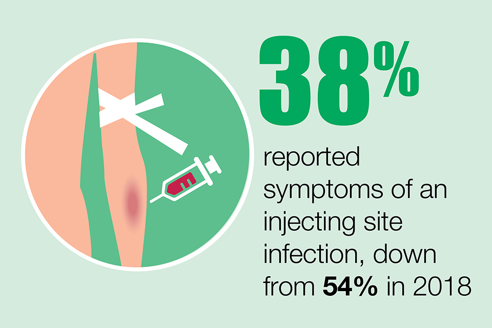 Thirty-eight percent reported symptoms of an injecting site infection, down from 54% in 2018.