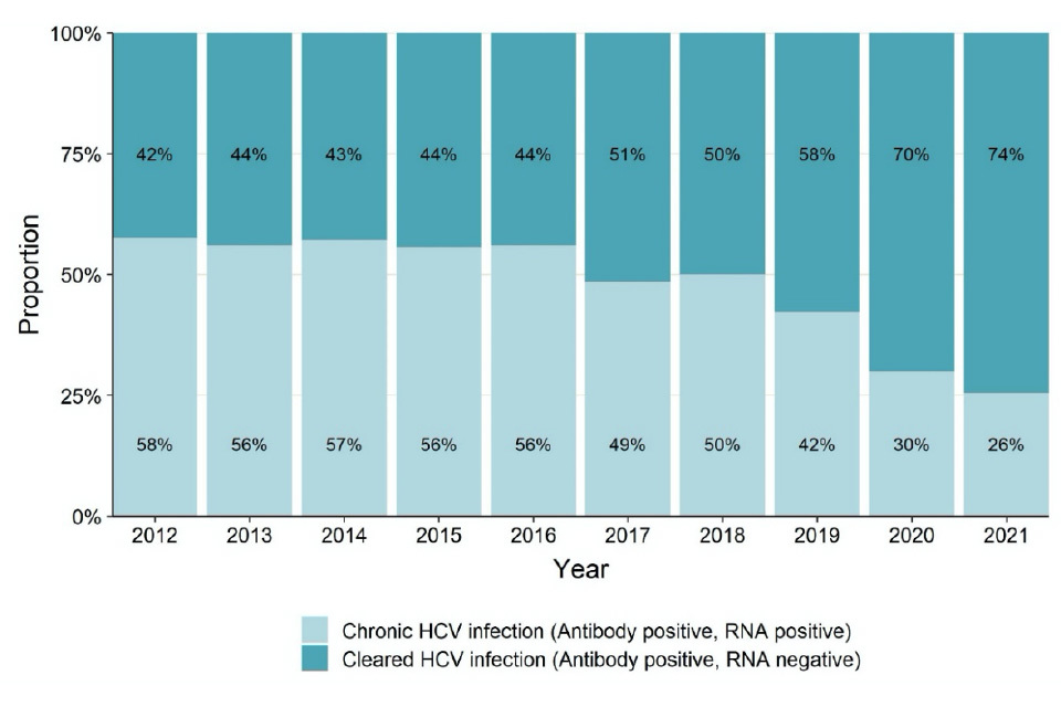 Figure 1. Prevalence of chronic HCV (RNA-positive) among anti-HCV-positive participants in the UAM Survey of PWID: England, Wales, and Northern Ireland, 2012 to 2021