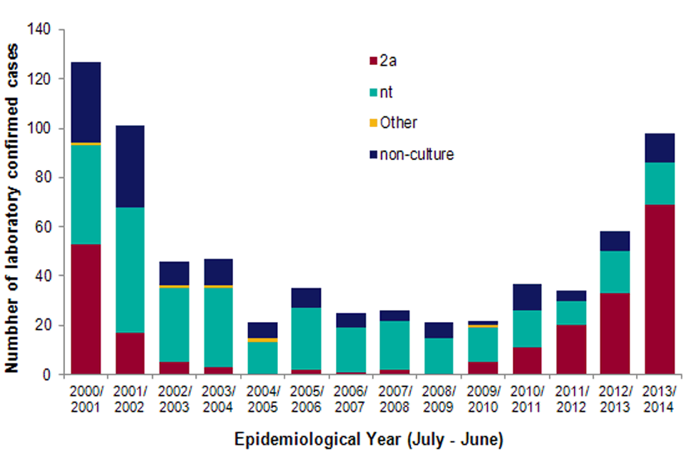England and Wales is experiencing an upsurge in invasive capsular group W (MenW) disease. Historically, MenW incidence has been low, accounting for only 1-2% of invasive meningococcal disease (IMD) cases annually. An increase in 2000-2002 was associated with pilgrimage to Hajj. After the introduction of a mandatory meningococcal vaccination for pilgrims, MenW cases in England and Wales declined to pre-2000 levels. Since 2009/10, MenW cases have increased year-on-year such that there were 98 confirmed cases during June 2013 to July 2014 (2013/14), accounting for 15% of all invasive meningococcal cases. This increase has been observed across all English regions. Phenotypic characterisation of the MenW isolates revealed that the increase was nearly all caused by MenW strains phenotypically expressing PorB serotype 2a, associated with the cc11 clonal complex.