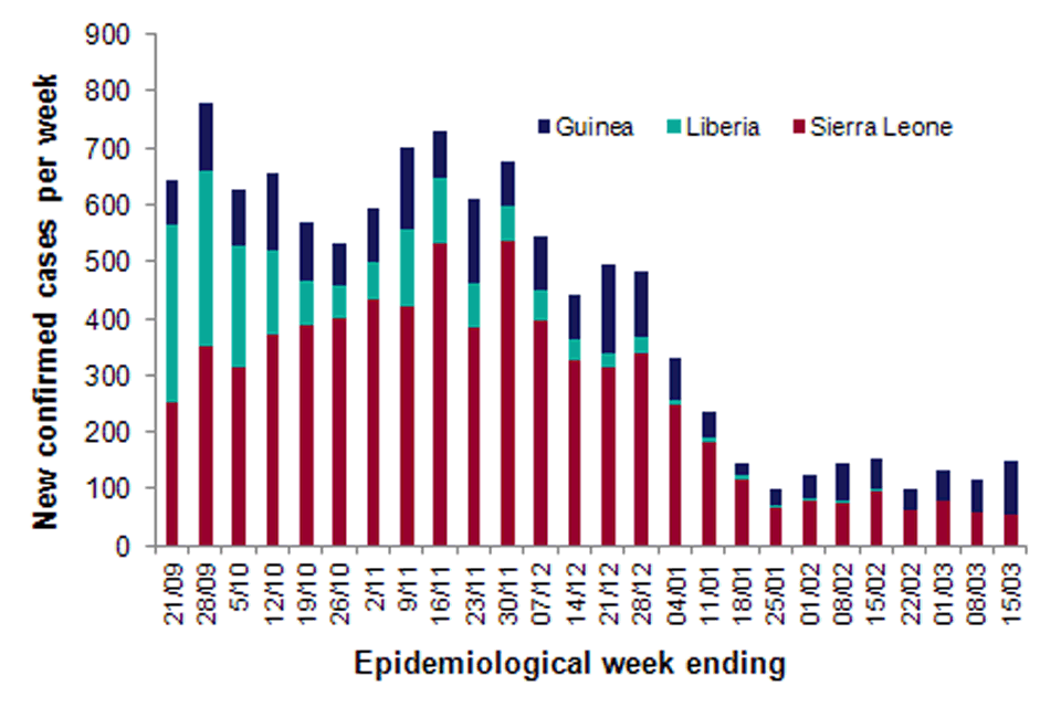 In the currently affected countries in West Africa (Guinea, Liberia and Sierra Leone), a disparate epidemiological situation exists. For the third consecutive week (to 15 March), Liberia reported no new confirmed EVD cases. In contrast, in Guinea and Sierra Leone there were a total of 150 new confirmed cases (95 in Guinea and 55 in Sierra Leone) reported in the past week (to 15 March). Constant vigilance is required in Guinea, Liberia and Sierra Leone to prevent further geographical dispersion of cases. The complex nature of this outbreak means that EVD control in West Africa will require significant and sustained effort.