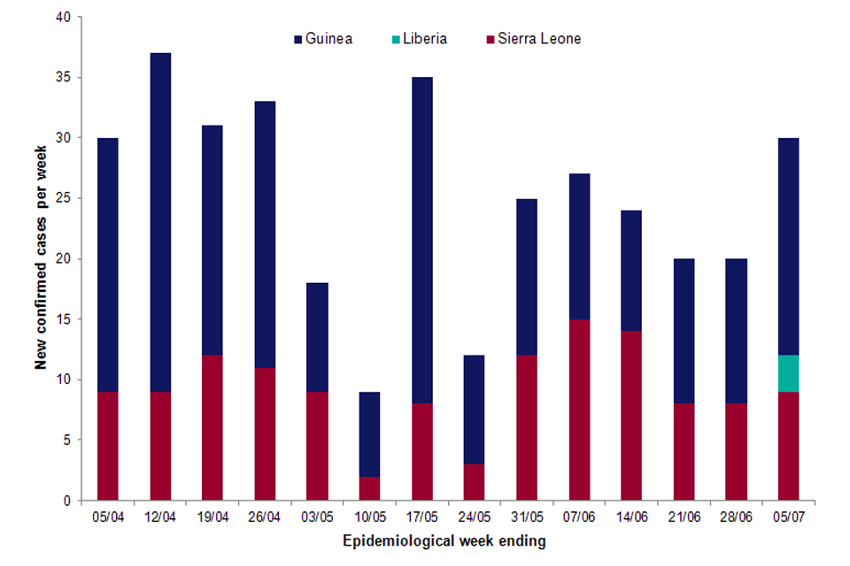 The Ebola Virus Disease (EVD) outbreak in West Africa continues with between 10 and 30 cases reported each week from currently affected areas. As of 5 July 2015, a total of 27,609 clinically compatible cases of EVD and 11,261 deaths have been reported associated with the West African outbreak.