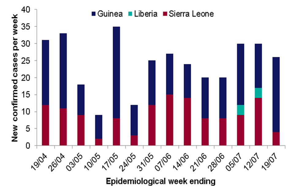 Number of new confirmed cases reported per week (19 April to 19 July 2015) in affected countries in West Africa. (Data Source: WHO Ebola Situation Report 22 July 2015)
