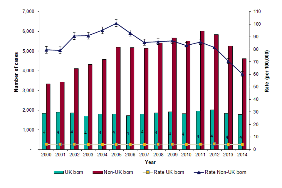 TB case notifications and rates (95% confidence intervals) by place of birth, England, 2000-2014. Note: confidence intervals around the UK born population rate are small and therefore not visible.