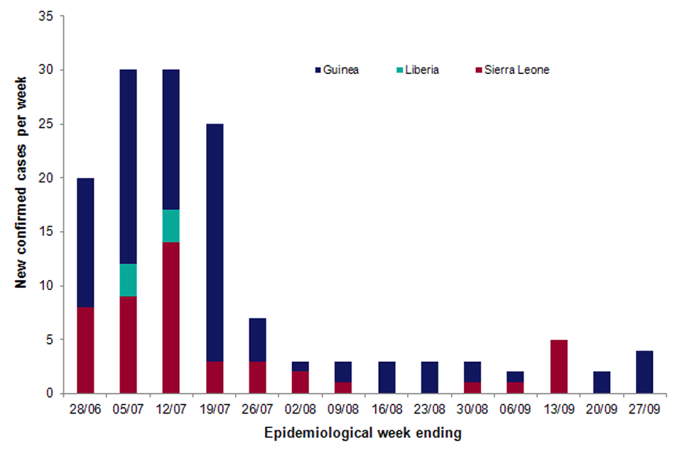 Number of new confirmed cases reported per week (28 June to 27 September 2015) in affected countries in West Africa. (Data source: WHO Ebola Situation Report 1 October 2015)