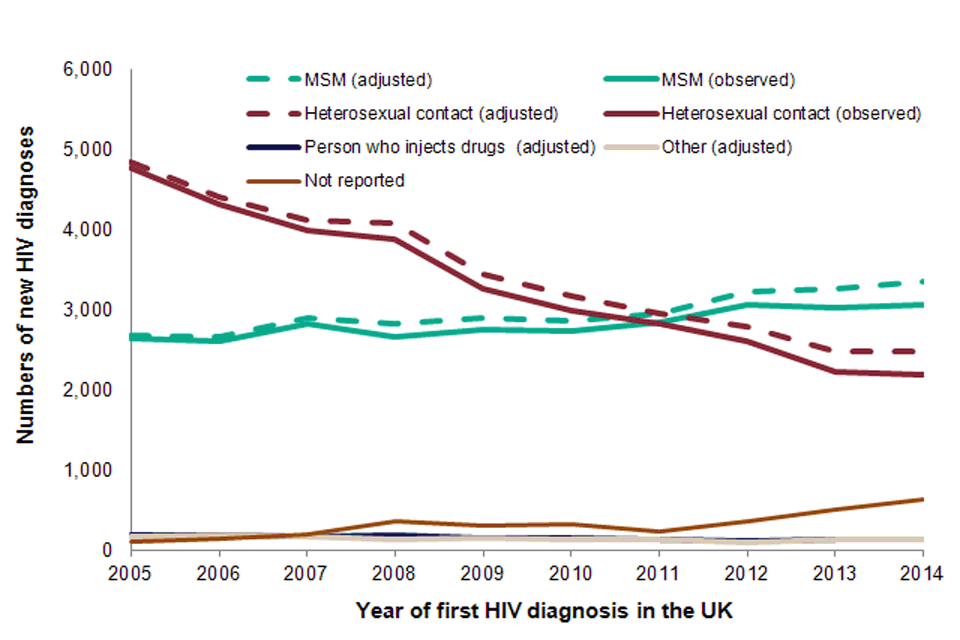 The number of men who have sex with men (MSM) newly diagnosed with HIV continued to rise from 2,860 men in 2010 to 3,360 men diagnosed HIV positive in 2014 (figure 2). New diagnoses acquired through heterosexual sex have declined over the same time period (3,440 to 2,490), largely due to a reduction in diagnoses among black African men and women (1,801 in 2010 to 1,044 in 2014).